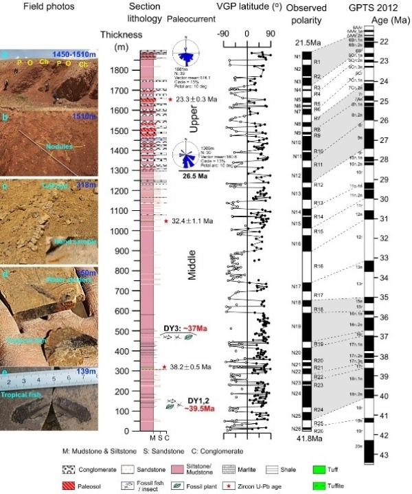 经过长期研究,方小敏团队对伦坡拉盆地北部达玉山山前海拔近2000米的新生代地层剖面进行了古地磁年代测定,对剖面上发现的三层火山凝灰岩和沉凝灰岩进行了绝对年龄激光测定,首次获得了伦坡拉盆地早新生代连续高精度的磁性地层年代序列。进一步研究发现,该区域古土壤的年代为约2600至2150万年,热带动植物化石的年代为约3900万年前(图2)。