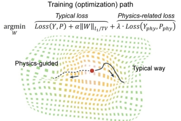 图1.物理机制约束(Physics-guided)下的深度学习求解图示;常规方法(Typical way)仅关注解空间中的最小值点,而忽略具有物理一致性的解