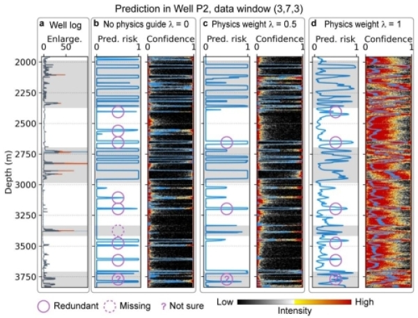 图3.新井位井壁失稳地质风险预测结果。(a)测井井径测量结果(阴影区为明显坍塌地层);(b)常规纯数据驱动的预测结果;(c)加入合理物理机制约束的预测结果;(d)加入过多先验约束的预测结果。图中:紫色实线圆圈-误报;紫色虚线圆圈-漏报;问号-不确定的争议结果。b-d中的右列图:预测结果不确定性分析,红色部分越居中性能越差