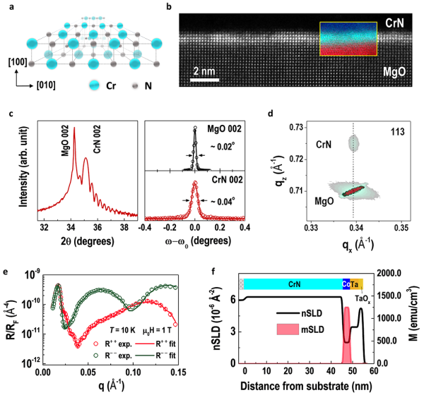 图1.超薄CrN单晶薄膜的结构和磁性表征。(a)CrN晶体结构示意图。(b)单原胞层CrN薄膜的高分辨透射电镜图。50原胞层CrN薄膜的(c)X射线衍射曲线和(d)倒易空间矢量图。(e)Ta/Co/CrN多层膜的极化中子反射谱。(f)Ta/Co/CrN多层膜的密度和磁性随薄膜厚度的分布图。