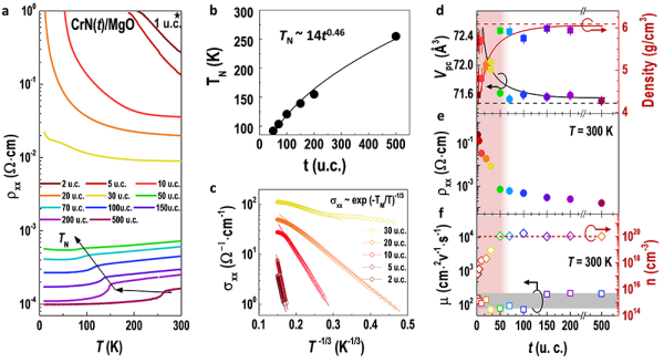 图2.CrN的电输运特性随厚度的变化规律。(a)厚度从1至500原胞层CrN薄膜的电阻率随温度的变化规律。(b)聂耳温度随薄膜厚度的变化关系。(c)不同厚度CrN薄膜的电导率随T-1/3的变化关系。(d)密度和体积、(e)室温电阻率、(f)迁移率和载流子浓度随CrN薄膜厚度的变化规律。