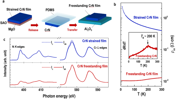 图3.20原胞层厚度的自支撑CrN薄膜制备和表征。(a)自支撑CrN薄膜制备过程示意图。(b)受应力调制和自支撑CrN薄膜的电阻率-温度变化曲线。(c)受应力调制和自支撑CrN薄膜的氮K边和铬L边的X射线吸收谱。