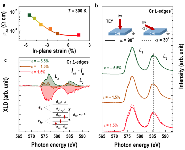 图4.CrN薄膜中受应力诱导的金属-绝缘体转变。(a)随失配应力变化的室温电阻率。三种应力状态下CrN薄膜的(b)X射线吸收谱和(c)X射线线性偏振谱。
