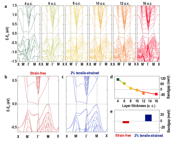 图5.CrN的能带结构随薄膜厚度和面内应力的变化趋势。(a)4至16原胞层CrN薄膜的能带结构演化图。(b)无应力和(c)受2%面内张应力作用的CrN能带图。(d)能隙随CrN厚度的变化关系。(e)无应力和受2%面内张应力的CrN能隙对比。