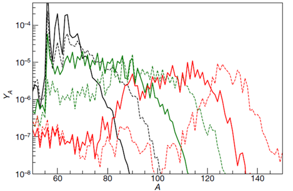 图1.在Ye=0.6,τ=10ms,S=80(黑),140(绿),200(红)的环境下,实线代表增长的3α反应率,虚线是没有增长的,可以看到核合成均被明显的压制,重核素边界的质量数均被降低10到20(金仕纶/图)