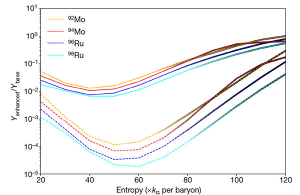 图2.随着熵的变化,考虑了增强的3α反应率和未考虑的所对应的92,94Mo和96,98Ru相对丰度。实线代表使用了反应率增强的中心值,虚线使用了反应率不确定度的上限,两者均显示这些核的合成会有呈量级式的抑制(金仕纶/图)
