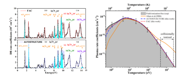 图2.类钠Kr25+离子的双电子复合精密谱和等离子速率系数。(左图)为0-15 eV范围内复合速率系数谱,黑色实线为实验测量结果,红色虚线和蓝色点线分别为FAC和AUTOSTRUCTURE理论计算结果,蓝色阴影代表Δn=1的跃迁贡献,竖线为理论计算各共振态结构。(右图)为等离子体速率系数,黑实线为实验结果,其他数据为理论计算结果。