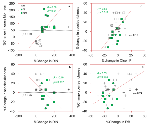 中国科学院沈阳应用生态研究所土壤化学组研究团队依托额尔古纳森林草原过渡带生态系统研究站,以长期施氮与刈割管理的半干旱草甸草原为研究对象,研究了不同粒径团聚体理化性质与植物生物量、物种丰富度间关联关系,及其对相关草地管理措施的响应特征。研究发现,施氮与刈割处理下,植物特性(生物量和物种丰富度)与大团聚体性质(有效养分和真细菌比值)呈现显著的关联关系,而该关联关系并不适用于微团聚体(如图所示)。这表明大团聚体是土壤养分氮、磷供应的主要结构单元,对植物生长具有更大的驱动作用。此外,植物物种多样性可能通过调控植物源碳的多样性,影响土壤大团聚体的微生物群落组成,继而对大、微团聚体内养分循环过程产生不同影响。