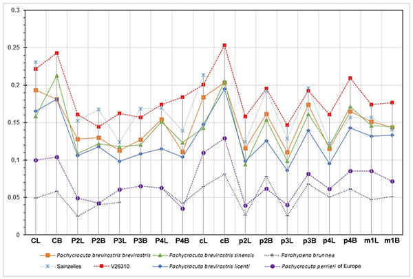 研究表明,在所有可比较的标本中,V26310的大小和形态最接近于产自法国Auvergne地区的Sainzelles标本(图2)。Sainzelles标本是Gervais(1850)创建(狭义)短吻硕鬣狗时记述的标本,即模式标本。此外,V26310在上、下裂齿以及前臼齿的附尖等形态特征上,有别于我国常见的桑氏和中国硕鬣狗,因此,这件标本(V26310)可明确鉴定为(狭义)短吻硕鬣狗,即指名亚种Pachycrocuta brevirotris brevirostris,这是我国乃至东亚地区的首例报道。(狭义)短吻硕鬣狗是依据法国Sainzelles标本而创建的,其现有化石记录主要局限于欧洲大陆,因而长期被视为欧洲的土著类群,而(狭义)短吻硕鬣狗在大连金远洞的发现打破了这种固有认识。通过对比研究不同地区或年代的短吻硕鬣狗,研究人员发现这些鬣狗在大小和形态上存在若干细微差异(图3和4),且可能存在比较密切的联系。例如,V26310虽与(狭义)短吻硕鬣狗的模式标本最接近,但保留了桑氏硕鬣狗的若干形态特征,缩短了(狭义)短吻硕鬣狗与桑氏硕鬣狗之间的形态隔阂。我国陕西蓝田公王岭、德国Untermasfeld和意大利Olivola等地的短吻硕鬣狗同样揭示了不同短吻硕鬣狗之间可能存在的系统发育联系。据此,研究人员分析认为欧亚大陆的短吻硕鬣狗应归为同一物种,但需进一步划分为不同的亚种(群),这些亚种(群)彼此近乎构成一个具有祖裔演化关系的支系。芬兰古生物学家柯登(B. Kurtén)早在上个世纪五十年代提出了类似观点,但他主要认为这些亚种(群)为不同的地理亚种(群)。该研究对这一传统观点提出了挑战,提出这些亚种(群)不是因地理隔离分化而引起的,而是短吻硕鬣狗支系在不同演化阶段的表现。