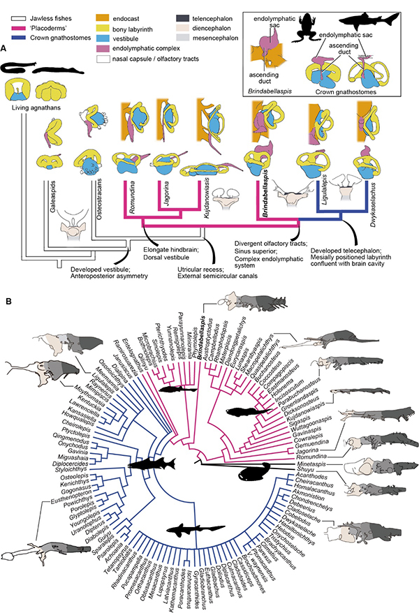 朱幼安等人应用高精度CT扫描数据,对在澳大利亚发现的两件新的、没有进行彻底酸蚀法清修的布林达贝拉鱼头部标本进行扫描和研究后发现,正是在过去不可知的区域内,隐藏着重要信息。布林达贝拉鱼内耳的上部(pars superior,即半规管)和下部(pars inferior,即前庭,包括椭圆囊和球囊)界限分明,前后半规管以发达的总脚(crus commue)和椭圆囊上腔(sinus superior)相连,这与此前所知的其他盾皮鱼类内耳不同,与现代有颌类相似。事实上,这些特征可在包括人类在内的大部分现代有颌类中找到。