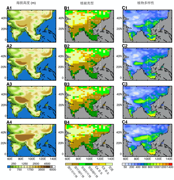 中国科学院西双版纳热带植物园古生态研究组联合英国布里斯托大学等研究人员,基于晚渐新世古地理数据对青藏高原不同地块的隆升进行了古气候数值模拟,并将结果运用到植被和植物多样性模拟中,与收集、整理的植物化石数据进行综合对比分析。研究表明,在青藏高原北部(羌塘地块和松潘—甘孜地块)隆升情景下,植被和植物多样性模型得到的结果与化石记录最为吻合。这说明青藏高原北部从古近纪到新近纪的隆升增强了东亚季风气候系统,驱动了东亚植被从以落叶阔叶林为主的干旱、半干旱植被类型转变为以常绿阔叶林为主的湿润、半湿润植被类型,并促进了植物多样性的增加。冬季降雨量的增加是驱动植被和植物多样性变化的最重要因素。青藏高原北部隆升对改变东亚季风以及驱动植被和植物多样性起决定性作用,间接支持了青藏高原东北向生长的理论。