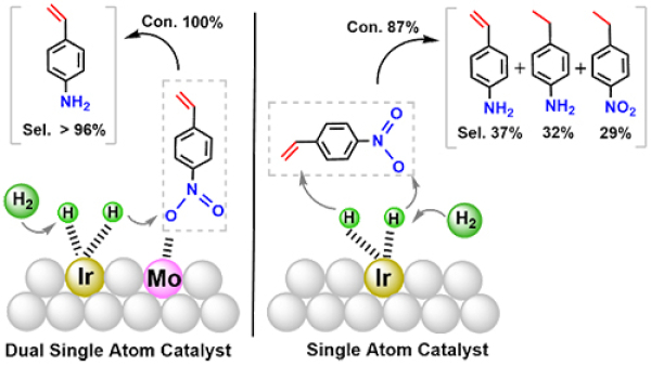 单原子催化是非均相催化领域的热点。双单原子催化剂具有两套单原子结构,两套单原子在催化反应中可以发挥不同功能,二者的协同作用可最大程度上提高原子利用率,并可提高催化的选择性。双单原子协同催化为在原子级别上理解双金属协同作用提供良好的平台。研究发现,在4-硝基苯乙烯选择性加氢反应中,双单原子催化剂Ir1Mo1/TiO2对4-氨基苯乙烯的选择性大于96%,远远优于单原子催化剂Ir1/TiO2(37%)和Mo1/TiO2(无活性)。理论计算表明,Ir单原子位点促进氢气的活化,Mo单原子位点吸附硝基苯乙烯,二者的协同作用提高了催化加氢的性能。