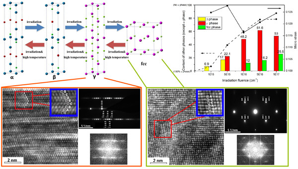科研人员首次系统发现并证实了离子辐照导致MAX相典型材料Ti3AlC2从α→β→γ→fcc结构的系列相变及其在高温下的系列逆相变(恢复)实验现象;多角度实验论证并阐明了辐照驱动的结构相变演化(晶格原子重组)的具体方式和过程机制;确认了晶格耗散和空位型缺陷的饱和效应是该类材料抗辐照非晶化的根本原因;澄清了关于β相的微观结构困扰,给出了关于其的正确表述方法和相关性质等。该研究对核能材料研究领域(尤其是对“抗辐照材料设计”)和深入理解辐照损伤演化机理等具有指导意义。