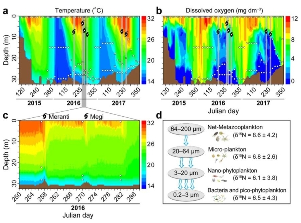 在当前气候变化背景下,预计全球热带和亚热带地区台风事件(又称热带气旋或飓风)的强度将持续增加,由此带来的强风和暴雨灾害事件将造成当地经济和生态系统功能的损失。深水型水库和湖泊具有重要的科学和社会服务价值,这些水体的一个典型特征是水体上下分层,如表层水体(湖上层)藻类较多和底层水体(湖下层)营养丰富。强风引起的混合扰动可将深层水体的营养物质带到光照充足的表层水体,而强降雨还可能会增加水体的陆源营养物质输入。这些营养盐的波动性增加通常伴随着藻类生物量的增加或浮游生物群落组成的变化。然而,在不断变化的环境中,采用新方法结合较高频率观测将促进对突发性干扰事件后,深水水体生物地球化学过程的理解。