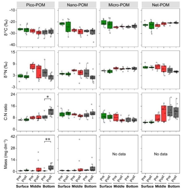图2.台风前后颗粒有机物碳氮同位素、化学计量和质量的变化