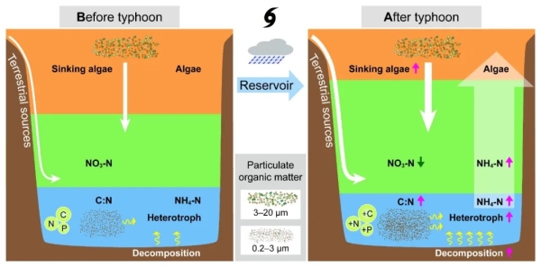 中国科学院城市环境研究所水生态健康研究组(杨军团队)选择亚热带深水型水库为研究对象,开展了为期三年的研究,以期阐明环境变化、颗粒有机物的稳定同位素和化学计量以及营养循环对台风的响应及其内在相互关系。结果显示,台风显著的改变了深层水体的营养水平及温跃层深度。台风导致水库表层水温降低、底层水温升高。台风后短期(如台风后的前10天)内,中层水体颗粒有机物浓度大于底层水体,而随后底层水体颗粒有机物浓度快速升高,并逐渐超过中层水体;中层水体颗粒有机物的浓度在台风后短期内显著增加,但随后迅速下降恢复至台风前的浓度水平,这伴随了底层颗粒有机物(藻类和死亡有机物)的积累和浓度的持续增加,表明台风后有机物(包括藻类)沉降是底层有机物的主要来源。随机森林和路径分析结果同样表明,叶绿素a与中层和底层水体的颗粒有机物和营养循环显著相关,因此,台风事件驱动的陆源有机物输入增加、藻类沉降和细菌异养分解共同作用,导致水库底层水体中总氮、铵态氮和总磷急剧增加且长期维持高浓度,进而增加水库和下游水体富营养化的威胁。