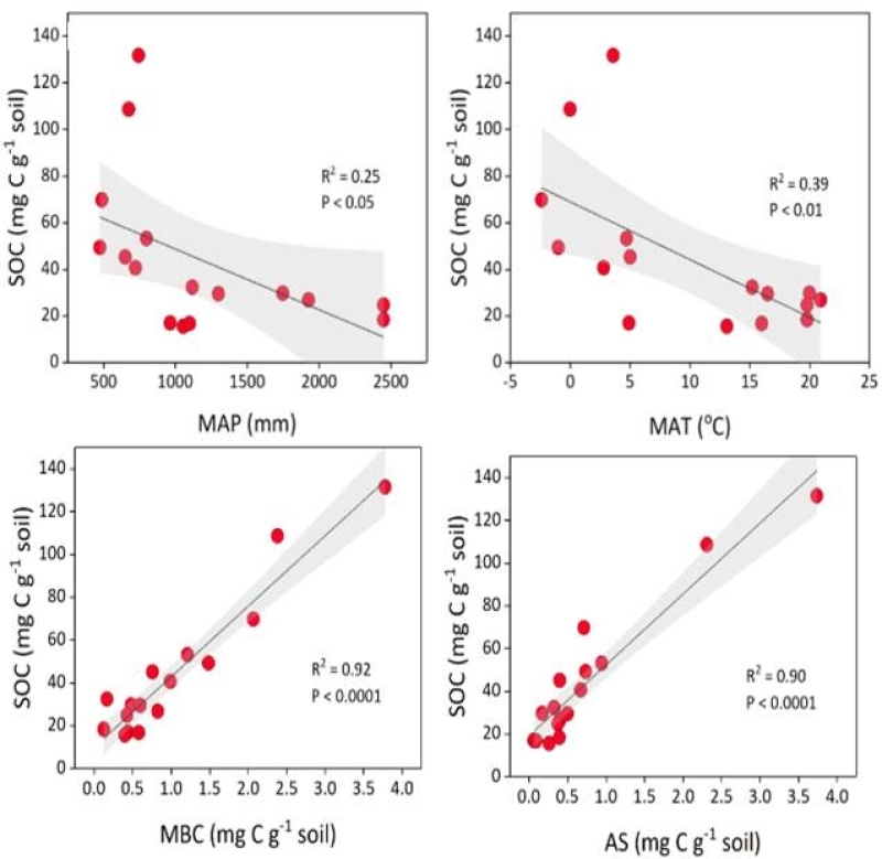 图2.土壤有机碳与气候、微生物生物量、氨基糖含量之间的关系