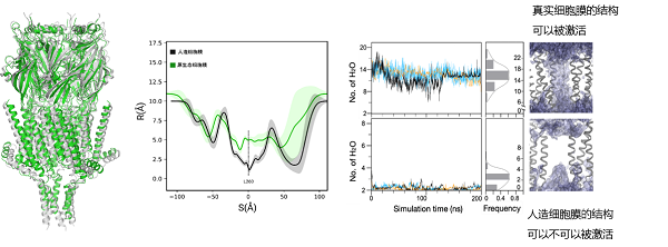 该研究首次在真实细胞膜环境下解析出5-HT3受体的三维精细冷冻电镜结构(PDB:6Y5A)。其主链的RMSD与人造细胞膜环境下解析的结构差异高达33埃;离子通道半径差异高达5埃。通过生理状态环境下的全原子分子动力学模拟发现,在人造细胞膜环境下解析的结构与激动剂结合后,不能激活5-HT3受体形成连续水分子通路,不能激活5-HT3受体行使生理功能和信号转导。而团队在真实细胞膜环境下所解析的结构在相同条件下可正常激活5-HT3离子通道并行使正常的信号转导。