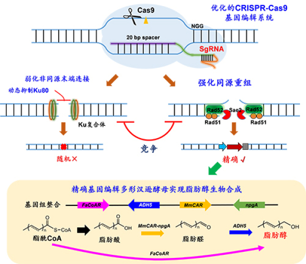 该工作构建和优化了基于CRISPR/Cas9的基因编辑技术,通过优化Cas9蛋白和sgRNA表达,成功将基因编辑效率提高至90%以上;在此基础上,通过动态调控非同源末端连接关键基因KU80和增强同源重组修复蛋白Rad51,Rad52,Sae2表达,将同源重组效率提高到60~70%,并揭示了同源重组和非同源末端连接的竞争关系;依托该系统,成功在汉逊酵母中实现基因无缝敲除、大片段整合以及多片段重组;在汉逊酵母中构建了脂肪醇生物合成途径,分别以葡萄糖和甲醇为底物实现了汉逊酵母发酵生产脂肪醇。