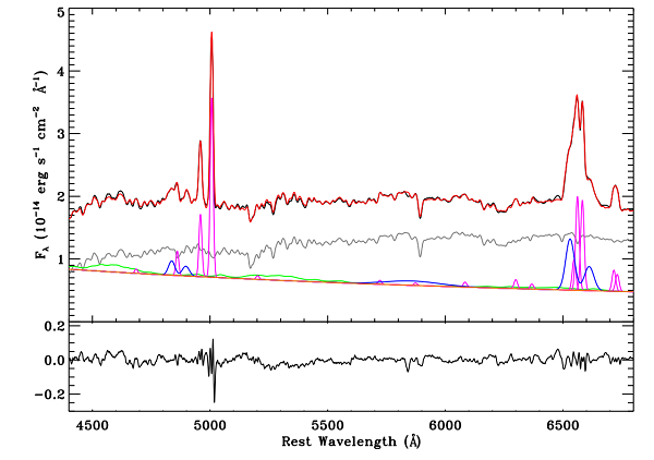 图1.黑色:平均光谱,蓝色:宽发射线,红色:最佳拟合,绿色:Fe II辐射,灰色:宿主星系辐射,洋红色:窄发射线,橙色:幂律谱。底部黑色曲线:残差