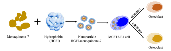 图1.载体蛋白对维生素K2进行亲水改性并促进成骨细胞分化的示意图