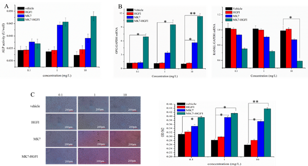 为了提高维生素K2的生物利用度,该研究利用两亲性载体蛋白对维生素K2进行亲水改性。通过优化载体蛋白与维生素K2(MK7)的混合摩尔比例,获得了在水溶液中均匀分散的球状纳米颗粒。将该维生素K2颗粒作用于MC3T3-E1细胞后发现,成骨细胞标志物碱性磷酸酶(ALP)、骨钙素、OPG/RANKL的表达均显著上调,细胞外矿化结节的形成也明显被加强,说明该维生素K2颗粒可有效促进成骨细胞分化。