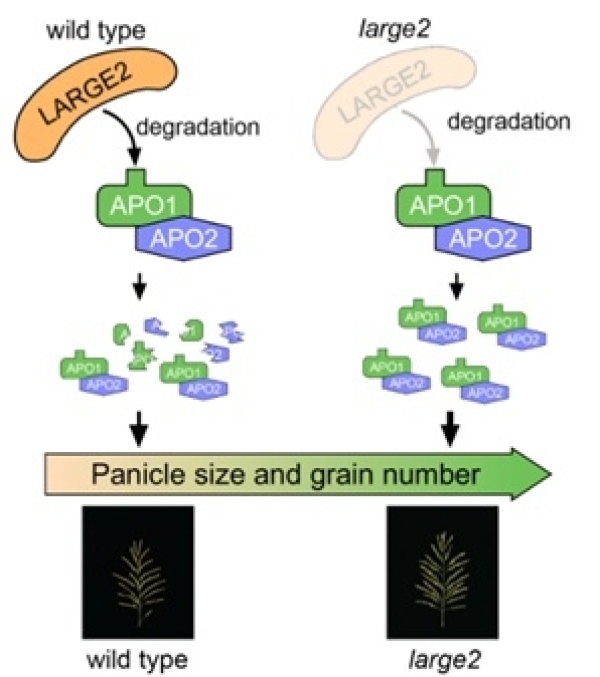 LARGE2-APO1/APO2途径调控水稻穗子大小和粒数的工作模型