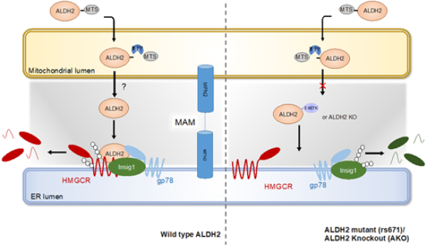 乙醛脱氢酶2(ALDH2)主要负责催化将饮酒产生的乙醛氧化成乙酸,以及代谢氧化应激脂质过氧化产生的活性醛类等。在动脉粥样硬化过程中,脂质过氧化与炎症反应是两个重要的风险因素。人体中有一个核苷酸多态性位点(SNP,rs671),携带这个突变的人群由于ALDH2酶活降低表现为饮酒后脸红。该突变影响全球8%的人群,而亚洲人群中有30-50%的人携带该突变。人群研究的数据显示这些人群除了喝酒脸红外,心血管疾病的风险也显著增加,相关分子机制有待进一步明确。试验室前期研究发现,ALHD2与低密度脂蛋白受体LDLR以及AMPK相互作用,影响泡沫巨噬细胞的形成(J Clin Invest, 2019),首次阐明了一个ALDH2突变增加动脉粥样硬化风险的独立于饮酒之外的分子机制。另外,既往的人群数据也显示ALDH2突变与胆固醇代谢相关,但分子机制不明。