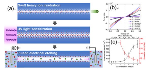 中国科学院近代物理研究所材料研究中心的科研人员采用重离子辐照技术,结合紫外光敏化和脉冲电场蚀刻,在PC膜中可控制备出平均孔径小于2.4—9.7埃的亚纳米孔道。研究表明,制备出的亚纳米孔道具有良好的阳离子选择性,并且表现出电压激活的离子非线性传输行为,该行为不同于传统化学蚀刻核孔膜的欧姆型离子输运形式。在离子分离实验中,具有亚纳米孔道的核孔膜表现出优异的离子分离性能,其Li+:Mg2+:La3+分离率高达3230:85:1。利用该方法制备亚纳米孔道分离膜,制备工艺简单可控,且具有良好的离子选择性。该研究为限域传质分离膜的研究提供了新思路,并将进一步推动聚合物多孔膜在海水和盐湖资源有效提取等方面的应用。