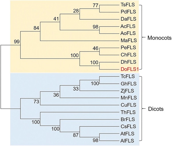 图1.铁皮石斛DoFLS1与其他植物FLS的系统进化树分析