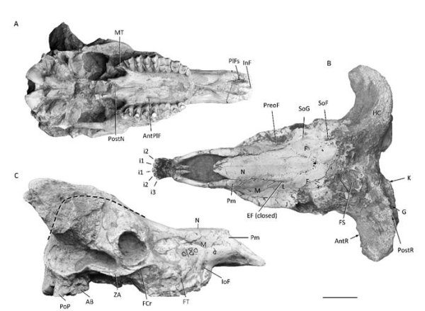 图1.和政羊头骨腹视、背视和侧视图(史勤勤供图)