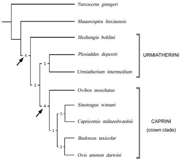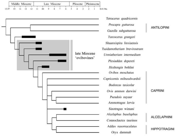 此外,研究人员还探究了和政羊的系统发育关系,梳理了中国晚中新世“麝牛类”牛科动物的系统发育关系。这是一类头骨和角心均很特化的牛科动物,其系统发育关系极具争议。尤其是近年来,分子生物学的发展为现生牛科动物的演化关系带来了一些新观点,特别是现生麝牛(Ovibos)不再与羚牛(Budorcas)构成姐妹群,而是与鬣羚(Capricornis)、斑羚(Naemorhedus)组成一个单系类群,位于羊族(Caprini)的基干位置,与传统的基于形态的分类学观点存在较大差别。在这样的背景之下,中国晚中新世“麝牛类”牛科动物的与现生麝牛的关系及它们在整个牛科动物演化关系中的位置都亟待讨论。该研究中,研究人员选取了110个头骨、牙齿及角心的形态学性状,建立了包含7种化石牛科动物、13种现生牛科动物的形态学矩阵,使用分支系统学的方法进行分析。结果表明,晚中新世“麝牛类”与中中新世土耳其羚(Turcocerus)、现生羊族、狷羚族、马羚族都位于同一支系上,但是和现生种类相比,它们都是该支系上较早的分支,是灭绝了的早期类型,与现生麝牛的类亲源关系较远。只有中华羚(Sinotragus)位于现生羊族、狷羚族和马羚族组成的冠群之中,是一种更进步的牛科动物。