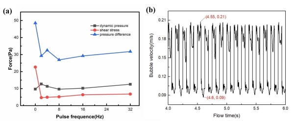 图3.(a)T型气液两相汇集处各作用力与脉动频率关系,(b)两相汇合后下游位置的气泡速度曲线(v0=0.1m/s, ε=0.5, f=8Hz)