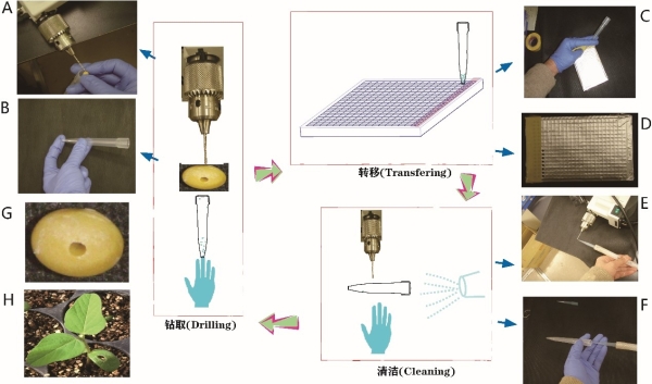 种子钻孔和样品采集过程。中间部分为整体流程简图,种子取样经钻取、转移及清洁3个部分,然后进入下一个种子的钻取。A-B 种子钻取:A、种子组织的钻取,B、移液枪头收集种子组织;C-D 种子样品的转移:C、钻取的种子组织转移至384深孔板中,D、一行转移后贴胶带保护;E-F 清洁:E、钻头的清洁,F、移液枪头及手套的清洁;G钻孔后的大豆种子;H、钻孔豆种子播种后14天的幼苗