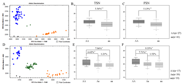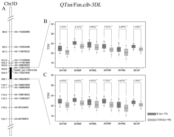 图4.在不同遗传背景下验证QTsn/Fsn.cib-3D