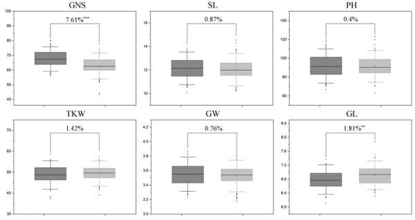 图3.QTsn/Fsn.cib-3D对产量相关性状的影响