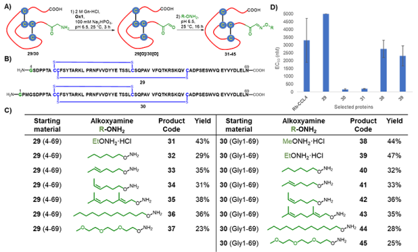 蛋白质趋化因子CCL4是HIV辅助受体CCR5的配体。科研人员利用该策略对CCL4的N-端进行转胺化修饰,快速得到一系列修饰蛋白质29-45。抗HIV-1活性体外实验表明,带修饰蛋白质30和31的抗HIV-1活性相较于表达的CCL4活性有显著提高。该实验表明,通过蛋白质化学合成与定点修饰联用可以在短时间内得到大量不同修饰的蛋白质,可为抗HIV蛋白质类药物的制备提供技术手段。