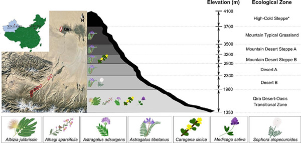 图1.昆仑山采样地点以及采集豆科植物示例