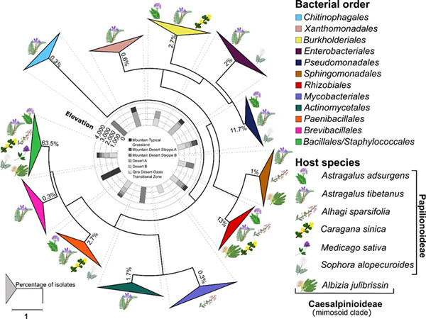 研究人员从该区域7个豆科物种中获得了300个根瘤相关细菌。研究显示,在分离株中,Bacillales是来自所有宿主豆类和所有海拔地区的主要分离株,其次是Rhizobial和Pseudomonadale。Bacillales和Pseudomonadales中出现了一些特定于海拔的模式,来自低海拔的策勒沙漠-绿洲过渡带(1350-1960 m)的根瘤菌表明了宿主专一性。