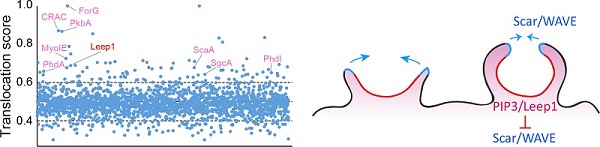 课题组利用模式生物Dictyostelium discoideum细胞中极性分子响应均匀场趋化因子刺激产生瞬时转移定位的现象,采用比较蛋白质组学方法对趋化因子刺激不同时间点的外周膜蛋白组分进行系统分析,鉴定得到一个新的极性分子,命名为Leep1(Leading edge enriched protein 1)。研究证明,Leep1通过其N端非典型PH结构域与PIP3结合而特异定位于巨胞饮杯(macropinocytic cup)和迁移细胞的前导端。结合成像和生化实验,通过对leep1敲除和过表达细胞的表型分析,发现leep1敲除细胞表现出巨胞饮和伪足动态的缺陷,而leep1过表达在促进丝状伪足的同时竞争性抑制板状伪足和巨胞饮结构,也导致细胞定向运动和巨胞饮的缺陷。免疫共沉淀-质谱方法鉴定互作蛋白发现,Leep1特异结合Scar/WAVE复合体,并通过对Scar/WAVE复合体的负调控,影响微丝结构的重排,从而调节不同前端结构间的动态平衡和细胞功能。