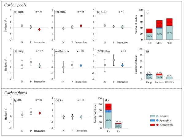 中国科学院华南植物园生态中心博士江军在研究员王应平和闫俊华的指导下,遴选了全球158篇氮磷施肥全因子实验 (control,+N,+P,+NP) 的研究论文,以编译的1928个有效观测数据为基础,运用meta分析方法,将氮磷交互作用划分为协同效应(synergistic)、对抗效应(antagonistic)和可加效应(additive),全面评估了8个地下碳循环关键变量(DOC、MBC、SOC、fungal/bacterial/total microbial biomass、Rh、Rs)对氮磷交互作用的响应。研究发现,地下碳循环过程对氮磷交互作用的响应以对抗和可加为主,氮磷交互作用促进了土壤有机碳的积累。