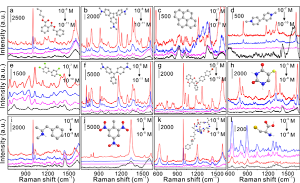图2.不同类型目标物分子SERS检测光谱图。(a)邻苯二甲酸丁苄酯(10-8 M ~ 10-11 M);(b)结晶紫溶液(10-8 M ~ 10-11 M);(c)芘(10-7 M ~ 10-10 M);(d)百草枯溶液(10-7 M ~ 10-10 M);(e)3,3',4,4'-四氯联苯(10-7 M ~ 10-10 M);(f)孔雀石绿(10-8 M ~ 10-11 M);(g)溴敌隆(10-7 M ~ 10-10 M);(h)5-氟尿嘧啶(10-5 M ~ 10-8 M);(i)冰毒(10-6 M ~ 10-9 M);(j)2,4,6-三硝基甲苯(10-5 M ~ 10-8 M);(k)节球藻毒素(10-6 M ~ 10-9 M);(l)半胱氨酸(10-5 M ~ 10-8 M)。