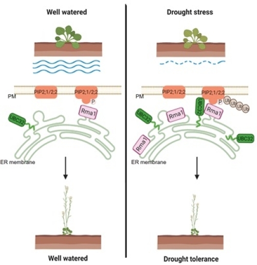 前期研究发现,UBC32是定位于内质网的泛素耦合酶,是ERAD复合体的重要组分。UBC32在转录水平受多种胁迫诱导,其蛋白参与降解错误折叠蛋白,同时其蛋白水平受到ERAD的调控。科研人员基于UBC32的高表达和敲除影响植物干旱相应的生物学现象进一步开展研究,采用IP/MS方法找到与UBC32互作的水通道蛋白PIP2;1/PIP2;2,UBC32直接结合PIP2;1/PIP2;2并促进其降解。进一步研究发现,RING类型的E3连接酶Rma1H1与UBC32一起形成特定的E2-E3复合物,通过负调控PIP2;1蛋白稳定性增强植物的抗旱性。PIP2;1的第276位K(PIP2;2为K274)被泛素化修饰后降解速度加快。此外,Rma1更易结合C端S280和S283位磷酸化修饰的PIP2;1/PIP2;2,S280/283D形式的PIP2;1蛋白稳定性更低。该研究揭示出蛋白质泛素化和磷酸化修饰在ERAD E2-E3复合物精细调控底物稳定性在植物干旱响应中的新机制。在水稻中高表达UBC32可显著提高水稻的耐旱性,为培育节水作物提供了良好材料。