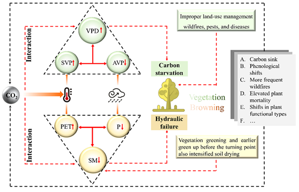 植被是陆地生态系统的一个重要组成部分,是连接大气、水和土壤之间的纽带。植被的生长动态被认为是对全球气候变化和人类活动的自然反应;植被也通过调节陆气之间的能量交换、水分平衡和大气中的二氧化碳浓度对气候产生反馈。已有研究报道了在温度升高和CO2的施肥效应下植被呈现不断的“绿化”,但也有研究指出不断升温导致空气中饱和水汽压(VPD)增大和土壤水(SM)的无效耗散增多,这些均对植被的健康生长产生了不利影响。