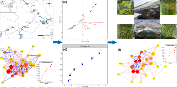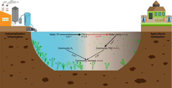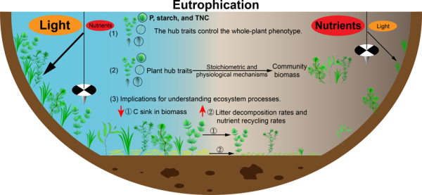 水体富营养化引起的营养富集和水下光照可利用性减少影响了水生生态系统的结构和功能,导致浅水湖泊发生稳态转换,因此探索影响淡水生态系统结构和功能的机制十分重要。富营养化通过改变水体光和营养的可利用性影响沉水植物的功能性状,如化学计量特征和生理状态。然而,目前尚不清楚连接沉水植物功能性状和生态系统结构和功能的机制,以及这些机制如何引起沉水植物的衰退。