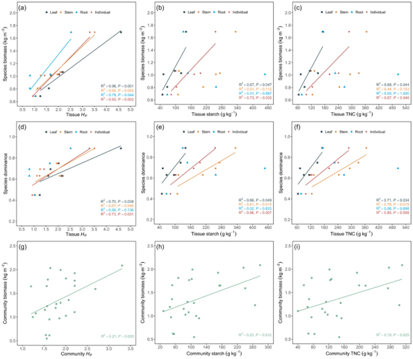 图2.磷化学计量内稳性(HP)、淀粉(starch)、总非结构性碳水化合物(TNC)与物种生物量(a-c)和优势度(d-f)以及群落生物量(g-i)之间的关系。
