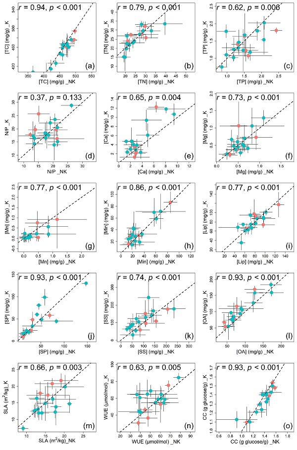 图1.优势树种叶片功能性状在喀斯特(K)和非喀斯特(NK)生境中的关联性。