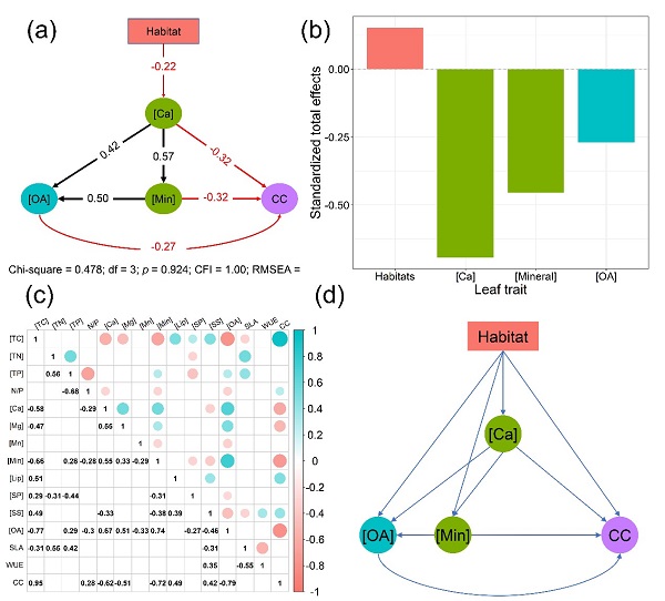 图2.优势树种通过提高叶片Ca含量并影响叶片有机酸(OA)、矿物质(Min)和叶片构建成本(CC)来适应喀斯特生境。