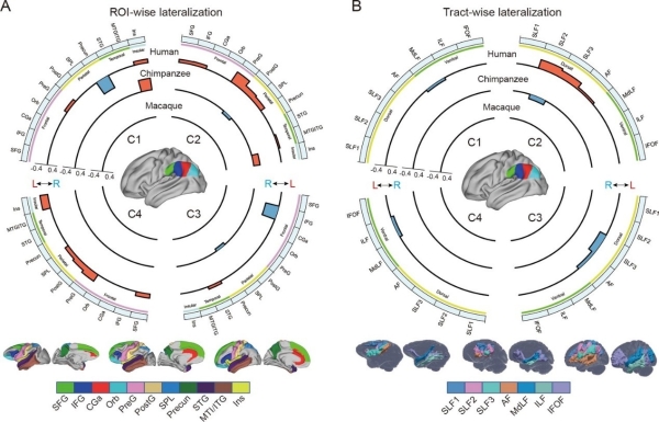 自动化所脑网络组研究中心提出利用绘制跨物种脑网络组图谱的手段研究不同物种的进化模式,为回答语言和复杂工具使用的进化脑机制提供了有力工具。研究人员首先利用磁共振成像技术获得了人类、黑猩猩以及猕猴的结构磁共振和弥散张量磁共振成像数据,并以语言和工具使用最相关的顶下小叶为研究对象,通过结构磁共振成像分析了三种灵长类顶下小叶结构上的不对称性。研究发现,在黑猩猩和人类中有相似的结构不对称性,但在猕猴中未发现类似模式,说明顶下小叶结构的分离出现在三个物种的共同祖先之后,而在黑猩猩和人类共同祖先之前。此外,研究人员进一步利用弥散磁共振成像,绘制了人类、黑猩猩和猕猴顶下小叶的亚区尺度的脑连接图谱,发现在三个灵长类物种间,脑解剖连接模式的不对称性呈现梯度式的进化模式,即与人类亲缘关系较远的猕猴中没有脑连接的不对称;但在与人类亲缘关系较近的黑猩猩中开始出现脑连接的不对称;并且这种不对称性在人类大脑中更广泛。上述研究表明,脑结构与其解剖连接模式的不对称性是驱动语言以及复杂工具使用进化的内在生物学基础。