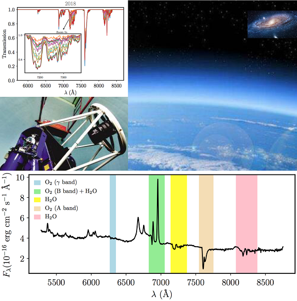 地基望远镜天文观测的大气吸收示意图。左上角是丽江天文观测站大气吸收谱(左上),来自遥远天体(右上)辐射的电磁波经过大气层后,被望远镜观测记录下来(左中),观测光谱中存在多个大气吸收带(下)